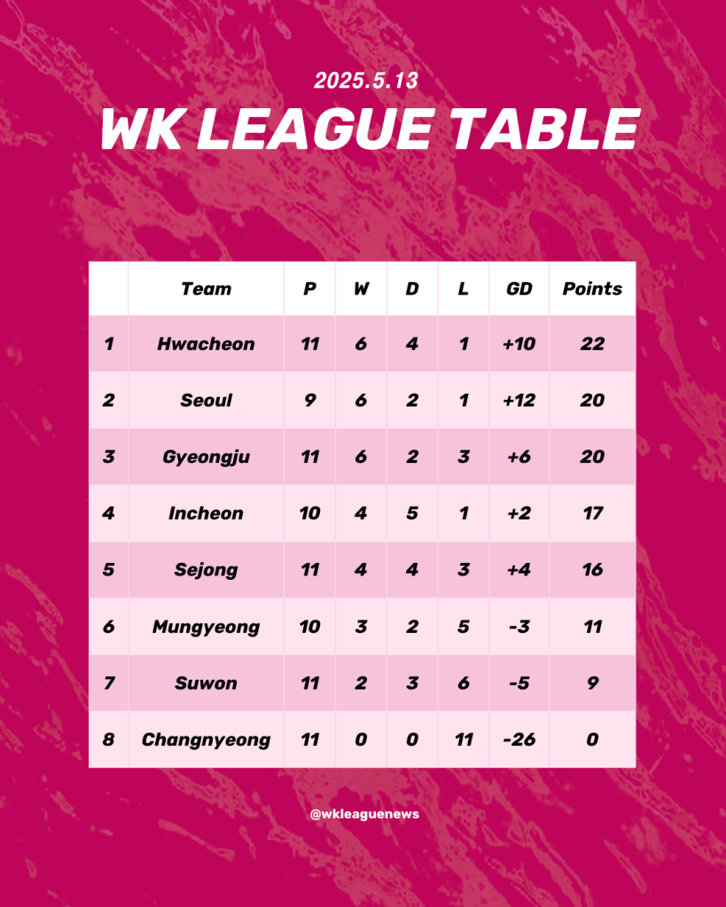 Two months into the season and with 42 league matches played, the 2025 WK League is well underway. With only six points between Hwacheon KSPO in first place and Sejong Sportstoto in fifth, there’s been plenty of movement in the top half of the table, boding well for an exciting fight for playoff spots as the season progresses. Here’s a quick overview of each team’s results so far.